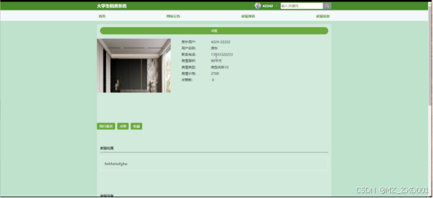 当普通用户点击“房屋信息”后,用户可以查看房屋信息详情,并可进行预约看房、点赞、收藏、评论等操作,界面如下图4-6所示。