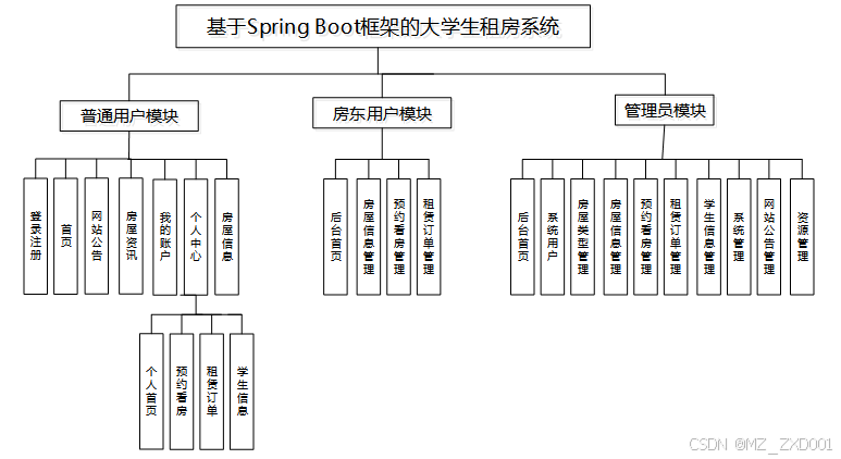 在上一章节中主要对系统的功能性需求和非功能性需求进行分析,并且根据需求分析了本系统中的用例。那么接下来就要开始对本系统的架构、主要功能和数据库开始进行设计。基于Spring Boot框架的大学生租房系统根据前面章节的需求分析得出,其总体设计模块图如图3-2所示。