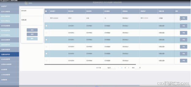 管理员点击“沟通信息管理”这一菜单会显示沟通信息列表这个子菜单,支持输入旧衣名称、沟通主题进行查询、重置和删除的操作。沟通信息列表界面如下图所示。