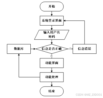 用户打开并进入系统后,会先显示登录界面,输入正确的用户名和密码,系统自动检测信息,若信息无误,则用户会进入系统功能界面,进行操作,否则会提示错误无法登录,操作流程如图2-5所示。