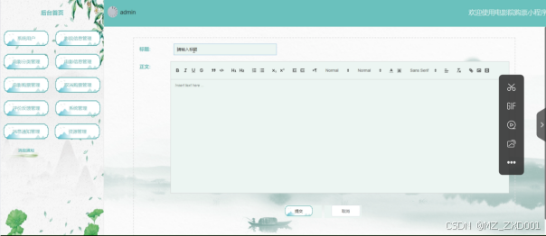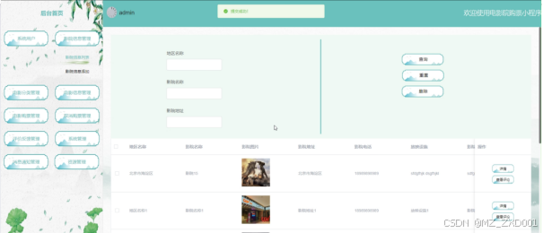 - 影院信息管理:管理员可以查看、删除、重置影院信息列表,也可以通过填写影院地址、图片、名称等信息添加影院信息。