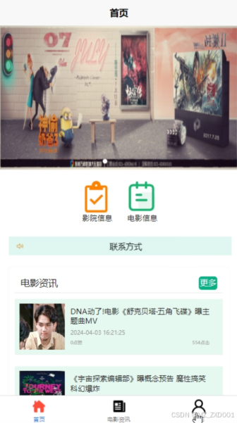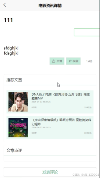 电影资讯模块:主要包括电影资讯信息浏览、电影资讯展示等功能,用户可以点赞、收藏和评论操作。电影资讯界面如下图所示。
