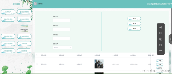 - 电影信息管理:管理员可以查看、删除、重置电影信息列表,也可以通过填写电影名称、海报、场次等信息添加电影信息。