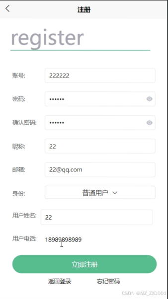 用户注册完成后,点击“登陆”进入到登陆页面,输入用户名和密码,点击“登陆”按钮,对用户名和密码进行验证,根据传入的用户名和密码在数据库中是否能查询到一条用户信息,若不能返回用户信息则登陆失败,页面提示用户名或密码错误。