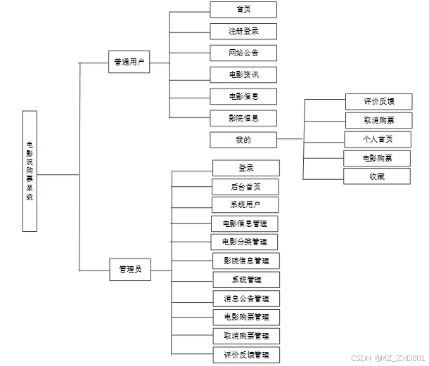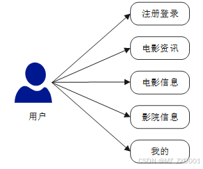 (1)我的:主要包括用户的注册和登陆、用户个人信息管理等功能,也包括电影购票、取消购票、评价反馈等信息。