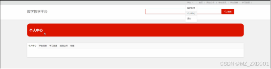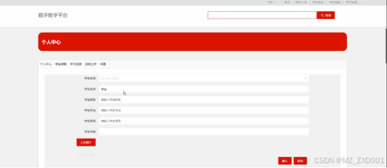 个人中心:用户点击头像可查看“个人中心”,包括学生信息、学习进度、成绩上传和收藏。界面图如下。