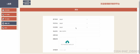 成绩上传:用户点击可查看成绩列表,同时可选择用户账号、学生专业、学生班级,输入考试学科、成绩分数,上传错题试卷和输入发布教师,点击“确认”进行添加新的学习成绩。界面图如下。