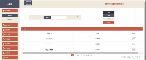 公共管理:管理员点击可查看轮播图和网站公告;如需添加新的轮播图,点击右侧“新增”按钮,上传图片,输入标题,点击“确认”按钮进行添加;如需添加新的网站公告,点击右侧“新增”按钮,输入标题和正文,点击“确认”按钮进行添加。同时可对轮播图和网站公告进行增删改查。界面图如下。