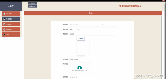 学习资源:点击可添加新的学习资源;学习资源内容包括输入课程名称,课程类别,上传图片,输入资料网站,上传学习内容和发布时间。界面图如下。