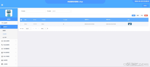 - 系统用户:管理员可以查看系统用户(管理员、子女用户、老人用户)列表中某个用户的详情,可以对用户信息进行增删改查操作。
