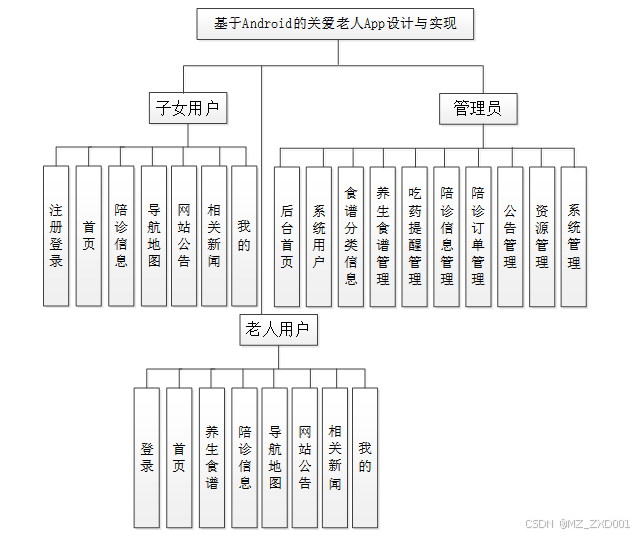按照基于Android的关爱老人App的功能模块,主要包括用户端(子女用户、老人用户)和管理端(管理员)这两大功能模块。