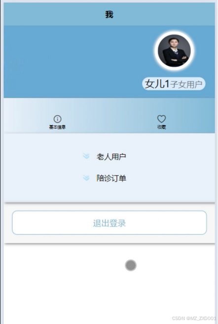 - 我的:用户点击首页右下角“我的”进入页面可以查看和管理基本信息、老人用户、陪诊订单和收藏;点击“退出登录”即可退出系统登录。