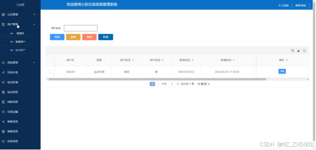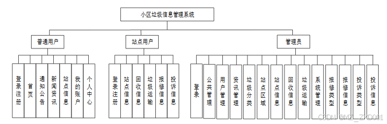 按照小区垃圾信息管理系统的角色,我划分为了普通用户、管理员、站点用户三大模块: