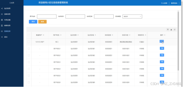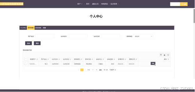 (6)站点信息:管理员点击站点信息,可查看站点信息的报修、投诉、回收、评论、详情,管理员可对站点信息进行增删改查。