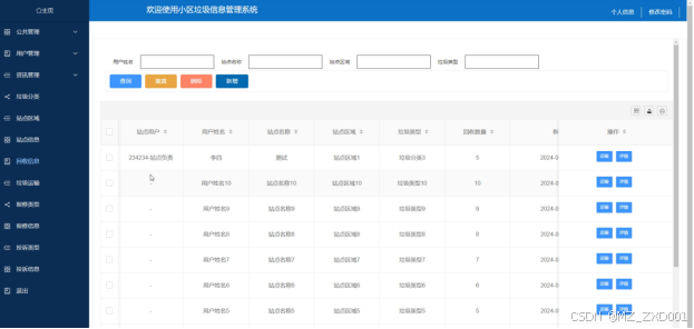 - 垃圾运输:管理员点击垃圾运输,可查看垃圾运输的回收数量、运输地点,可对垃圾运输进行增删改查。