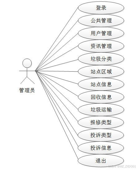 通过2.2功能的分析,得出了本小区垃圾信息管理系统的用例图: