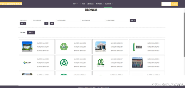 (5)站点信息:用户点击可通过站点区域、站点名称、用户名、垃圾分类搜索进行查看站点信息提供的站点区域、站点名称、基础设施,可以进入查看详细的介绍,可以进行报修、投诉、点赞、收藏、评论。