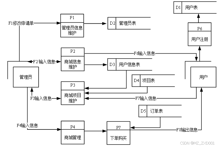 系统底层数据流:外部实体为管理员和普通用户,数据流分别有管理员和普通用户流向系统数据流程,数据表提供数据支持,来完成逻辑操作。