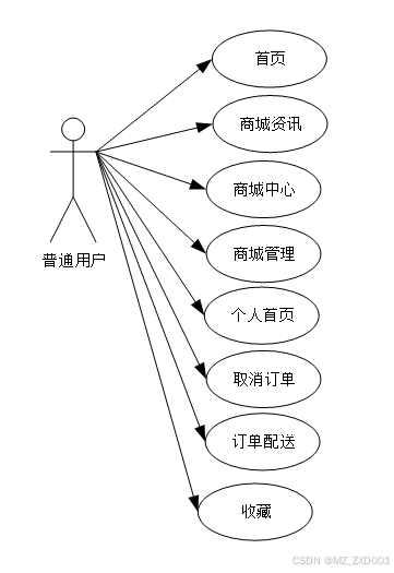普通用户模块功能有:用户:首页、商城资讯、商城中心、商城管理、个人首页、(取消订单、订单配送、收藏)
