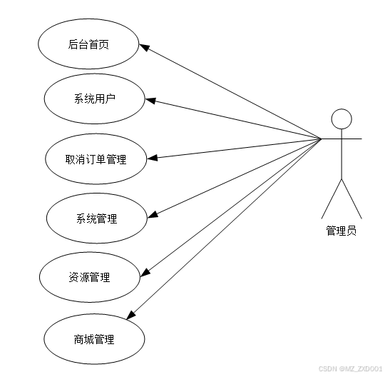 管理员模块功能有:后台首页、系统用户、取消订单管理、系统管理、资源管理、商城管理,管理员用例图如下所示。