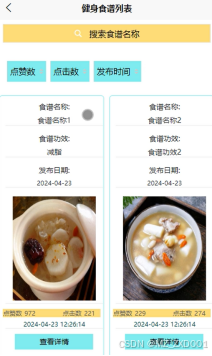 健身食谱模块提供健康饮食建议和食谱推荐,帮助用户制定合理的营养计划。用户可以根据个人健身目标、饮食偏好和饮食习惯选择适合自己的食谱。系统还会根据用户的身体状况和运动量推荐营养均衡的食谱,帮助用户更好地进行健身达标。通过健身食谱模块,用户可以获取到丰富的营养信息,助力健康的饮食生活。界面如下图4-12、4-13所示。