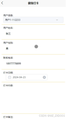 健身打卡模块用于用户记录自己的训练情况,包括完成的项目、训练时长、消耗的卡路里等信息。用户可以在每次训练后进行打卡,系统会自动记录并统计用户的健身数据,提供图表展示训练进度。用户还可以设定提醒功能,定时提醒自己进行每日训练并进行打卡。通过健身打卡模块,用户可以直观地了解自己的健身成效,保持持续的训练动力并实现健身目标。界面如下图4-18、4-19所示。