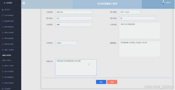 健身计划管理:管理员可以对健身计划的信息,进行添加、查询、删除等操作。
