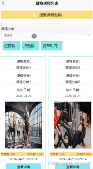 健身课程模块提供用户浏览、选择、预定各类健身课程的服务。用户可以浏览各种健身课程的详细信息,包括课程内容、时间表、教练介绍等。用户可以根据自己的健身需求和兴趣选择合适的课程,并进行预定。系统会提供课程推荐功能,根据用户的个人资料和偏好推荐适合的健身课程。界面如下图4-7、4-8所示。