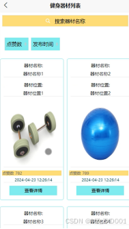 健身器材模块提供用户浏览健身器材的功能。用户可以搜索、筛选、查看各类健身器材信息,并进行收藏、点赞。还可以查看健身器材的详情介绍、用户评价等信息。系统还提供健身器材推荐功能,根据用户的健身需求和喜好推荐相应,界面如下图4-4、4-5所示。