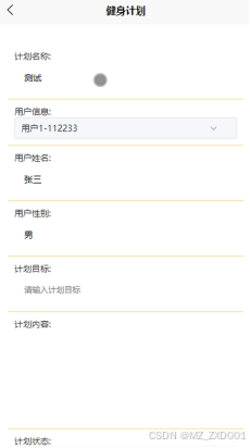健身计划模块提供个性化健身计划制定服务,用户可以根据自身需求和目标制定专属的训练计划。用户可以选择健身项目、训练频率、时长等进行定制,系统会根据用户的输入生成详细的健身计划,并提供每日、每周的训练安排。用户还可以记录每次训练的进度和成绩,系统会进行数据分析和评估,帮助用户不断调整和优化训练计划。界面如下图4-16、4-17所示。