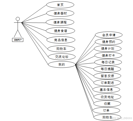 普通用户角色的用例包括首页、健身器材、健身课程、健身食谱、商品信息、购物车、交流论坛、我的(会员申请、健身预约、健身计划、健身打卡、每日记录、每日提醒、留言反馈、订单配送、基本信息、收货地址、收藏、订单、购物车)。