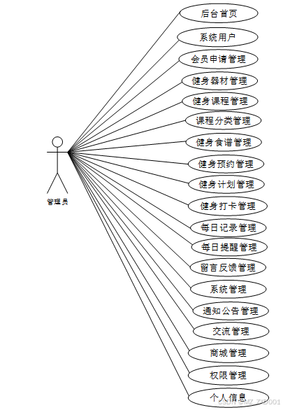管理员角色的用例包括后台首页、系统用户、会员申请管理、健身器材管理、健身课程管理、课程分类管理、健身食谱管理、健身预约管理、健身计划管理、健身打卡管理、每日记录管理、每日提醒管理、留言反馈管理、系统管理、通知公告管理、交流管理、商城管理、权限管理、个人信息。