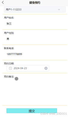 健身预约模块提供用户预约健身课程、私教服务和健身设备的功能。用户可以选择适合自己的健身项目和时间段进行预约,方便管理个人健身计划。此模块还支持查看课程信息、教练资质和健身设备情况,帮助用户做出更好的选择。预约成功后,系统会发送提醒通知,提醒用户按时参加健身活动,全面协助用户达成健身目标。界面如下图4-14、4-15所示。
