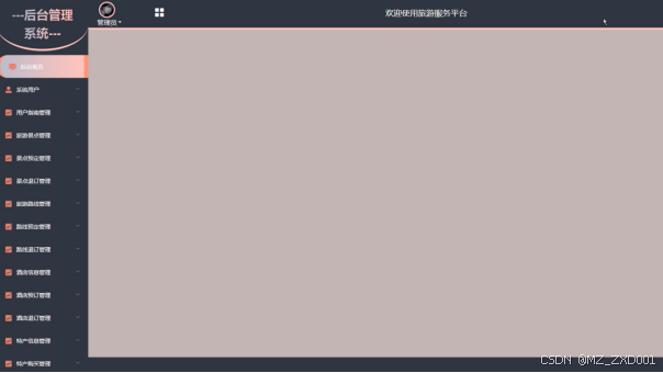 管理员登录进入旅游服务平台可以查看后台首页、系统用户、用户指南管理、旅游景点管理、景点预定管理、景点退订管理、旅游路线管理、路线预定管理、路线退订管理、酒店信息管理、酒店预定管理、特产信息管理、特产购买管理、特产退款管理、系统管理、公告消息管理、资源管理等功能并进行操作,如图所示。