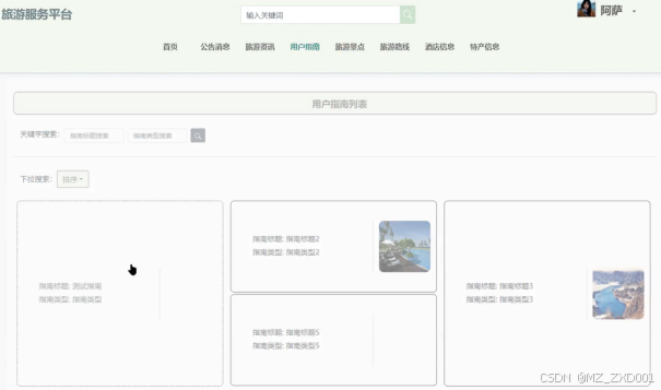 旅游景点,用户可以查看旅游景点列表,也可以通过搜索、排序等方式找到心仪的景点,可以进行预订、收藏、点赞、评论等操作,如图所示。