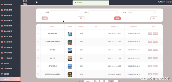 旅游资讯,在此页面管理员可以查看标题、封面图、文章分类、创建时间等,可以进行查询、重置、删除、添加等操作,如图所示。