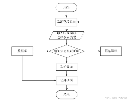 用户想进入系统,首先进入系统登录界面,通过正确的用户名、密码等信息,系统会检查登录信息,信息正确,然后输入相应的功能界面,提示信息错误,登录失败。系统操作流程如图所示。