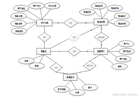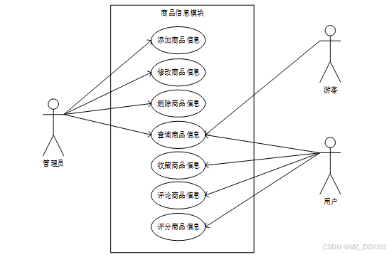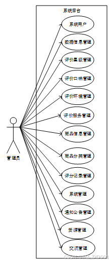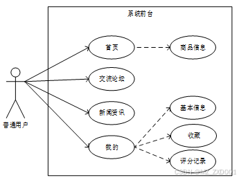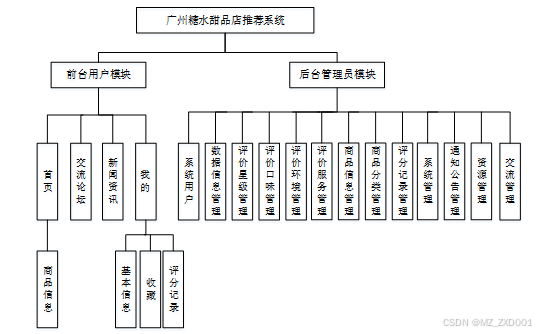 (3)确定好系统使用的技术,进行确认系统所划分的用户触,并且根据用户触划分确定所要设计的功能模块,对广州糖水甜品店推荐系统的设计主要划分别为普通用户和管理员,并且所使用的功能模块也相应不同,但系统的数据库实现的内容是交互的,普通用户可以随时根据自己的需求进行商品信息搜索及评价,对于管理员可以根据自己的权限进行在线信息的处理及操作。