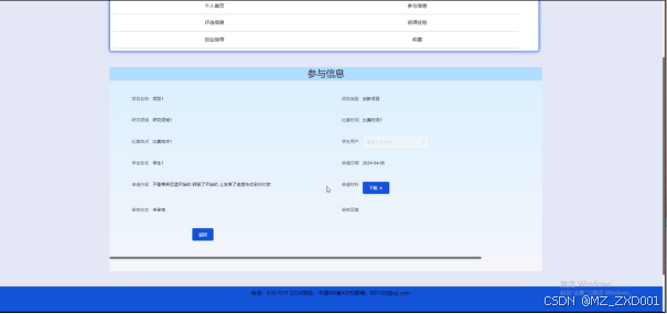 当导师用户点击个人中心“参与信息”按钮,可以查看和审核学生用户提交的项目参与信息。界面如下图所示。