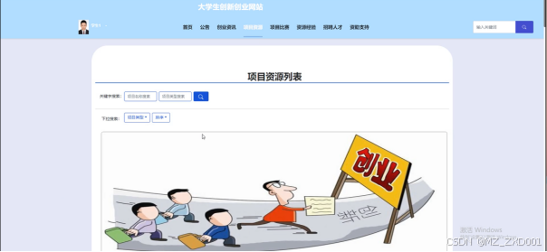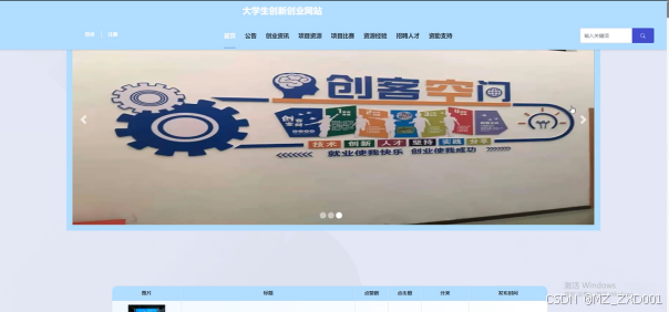 首页:展示网站的核心内容,包括最新创业资讯、热门项目资源、比赛信息等,以引导学生用户快速了解网站动态。