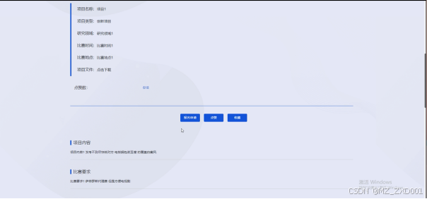 点击“项目比赛”这一菜单按钮,学生用户可以查看各类创业比赛信息,包括比赛主题、参赛条件、奖励机制等,可以提交报名申请、点赞、收藏、评论等。界面如下图所示。