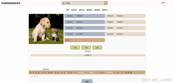 用户点击宠物转让之后,会展示宠物转让详情信息,宠物转让详情信息中有一个操作列表,包括有收藏,评论与领养,点击预订这个按钮会跳转到相对应的宠物领养页面,宠物的领养需要填写领养的日期,宠物的年龄等信息。