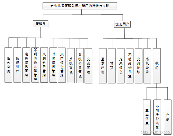按照走失儿童管理系统小程序的角色,划分了注册用户管理模块、管理员模块这两大部分。