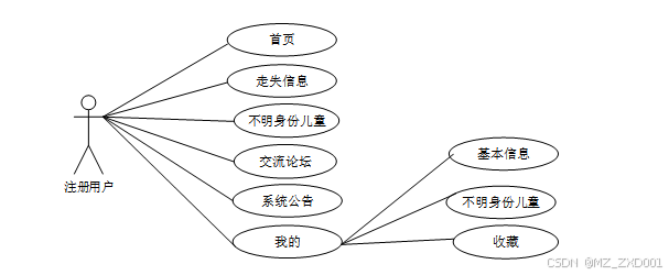 通过2.2功能的分析,得出了走失儿童管理系统小程序的用例图: