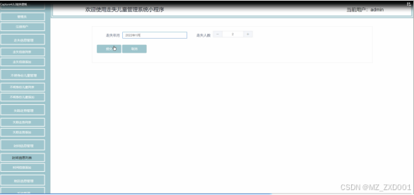 时间信息管理,管理员点击“时间信息管理”会显示出时间信息列表和时间信息添加这两个子菜单,支持输入走失年月进行下载导入文档、查询、重置、和删除的操作。通过输入走失年月、走失人数进行添加时间信息。时间信息列表和时间信息添加界面如下图所示。