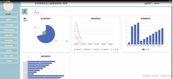 管理员登陆系统后,可以对:后台首页、系统用户、走失信息管理、不明身份儿童管理、失踪走势管理、时间信息管理、地区信息管理、系统管理(轮播图)、系统公告管理、交流管理(交流论坛、论坛分类)等功能模块进行相对应操作,在首页功能界面可以查看走失信息统计、失踪走势统计、时间信息统计、地区信息统计表,如下图所示。