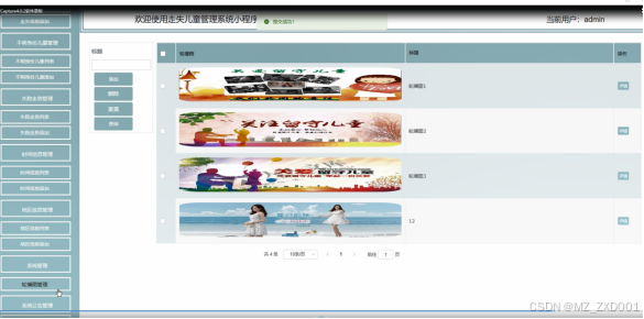 系统管理,在系统管理页面管理员可以对系统前台展示的轮播图进行增删改查,方便用户进行查看。如下图所示。