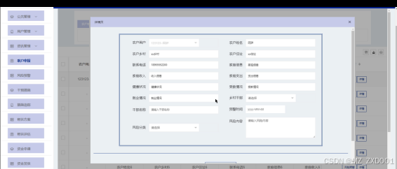 风险预警:用户点击可查看风险预警列表,同时可进行相关操作。点击“干预措施”可选择干预措施和输入干预详情;点击“帮扶方案”可填写帮扶方案详情。点击“资金申请”可填写申请信息,包括申请时间、申请金额、申请备注。界面图如下。