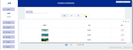 (2)公共管理:管理员点击可查看轮播图和公告消息;如需添加新的轮播图,点击右侧“新增”按钮,上传轮播图图片和输入标题,点击“确认”按钮进行添加;如需添加新的公告消息,点击右侧“新增”按钮,输入标题和正文,点击“确认”按钮进行添加;同时可对轮播图和公告消息进行增删改查。