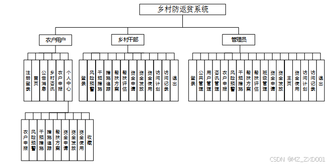 乡村防返贫系统将分为农户用户、乡村干部和管理员三个角色,具体功能分析如下: